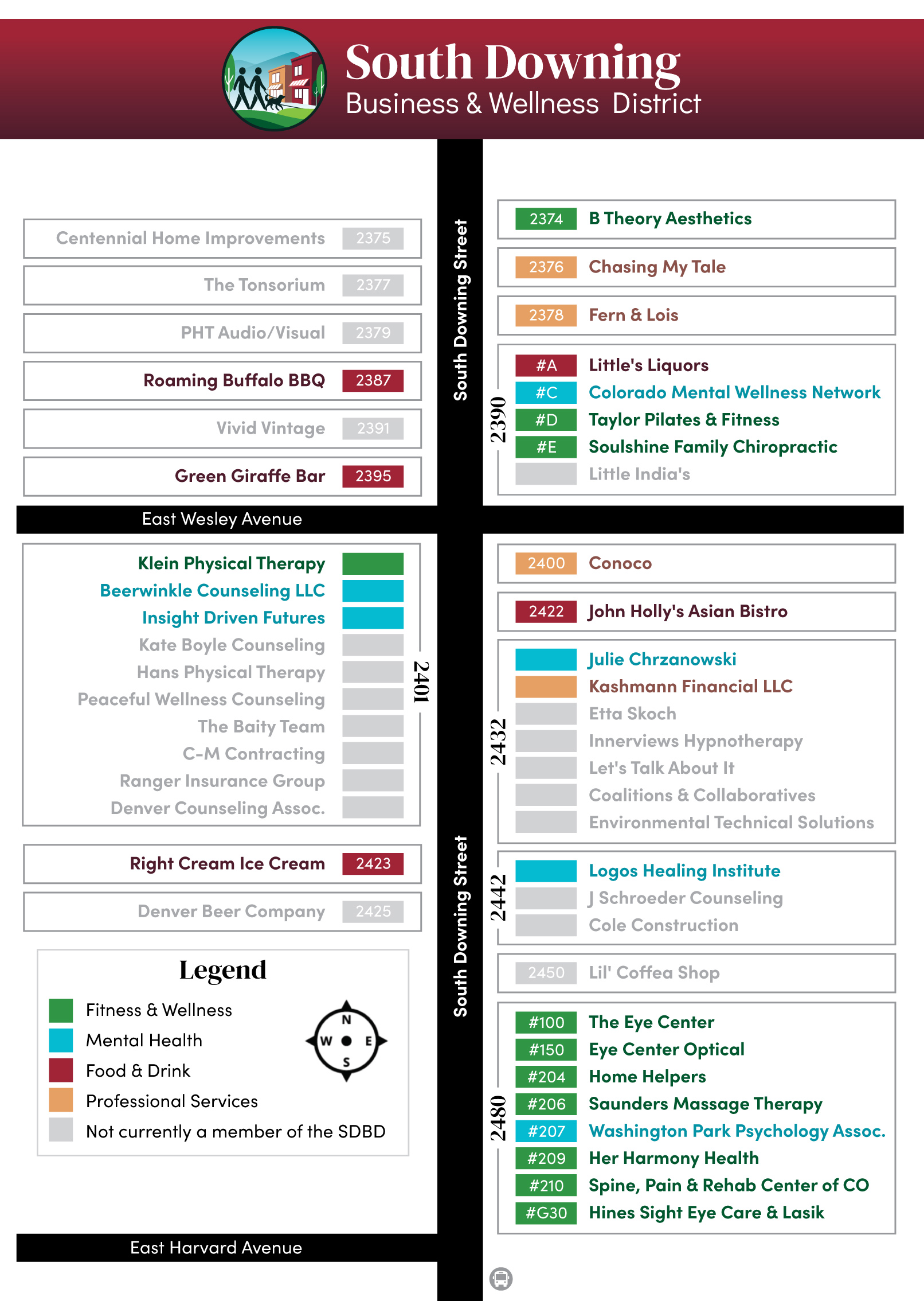 The South Downing Business & Wellness District stretches from Iliff to Harvard Avenues; just north of Porter Adventist Hospital. South Downing Merchants are located from the 2300 to the 2500 blocks.